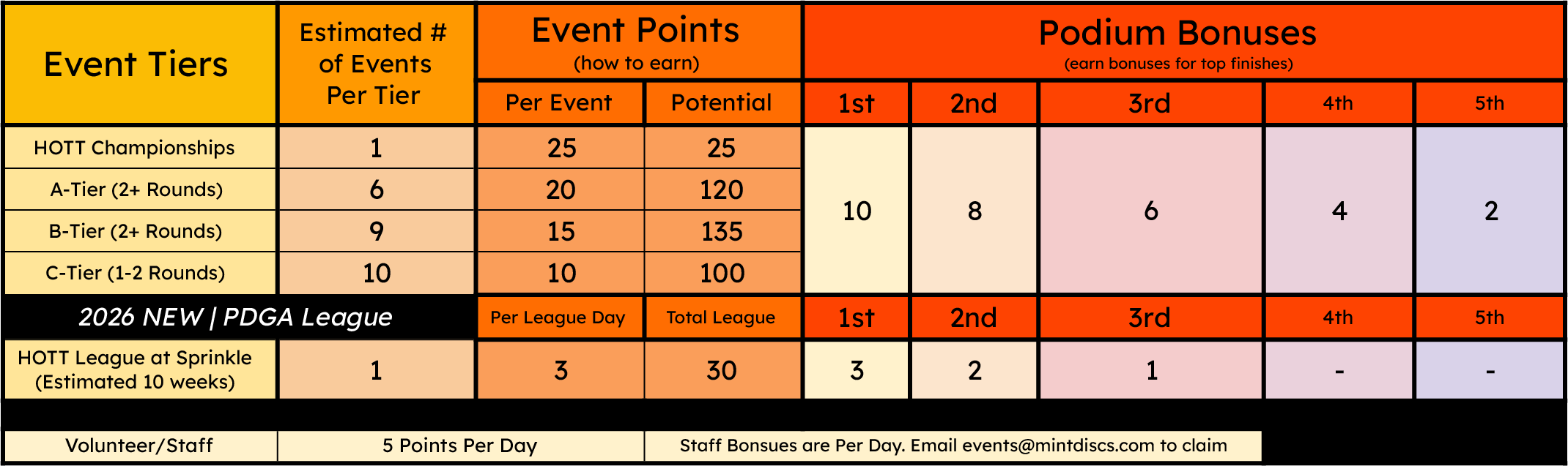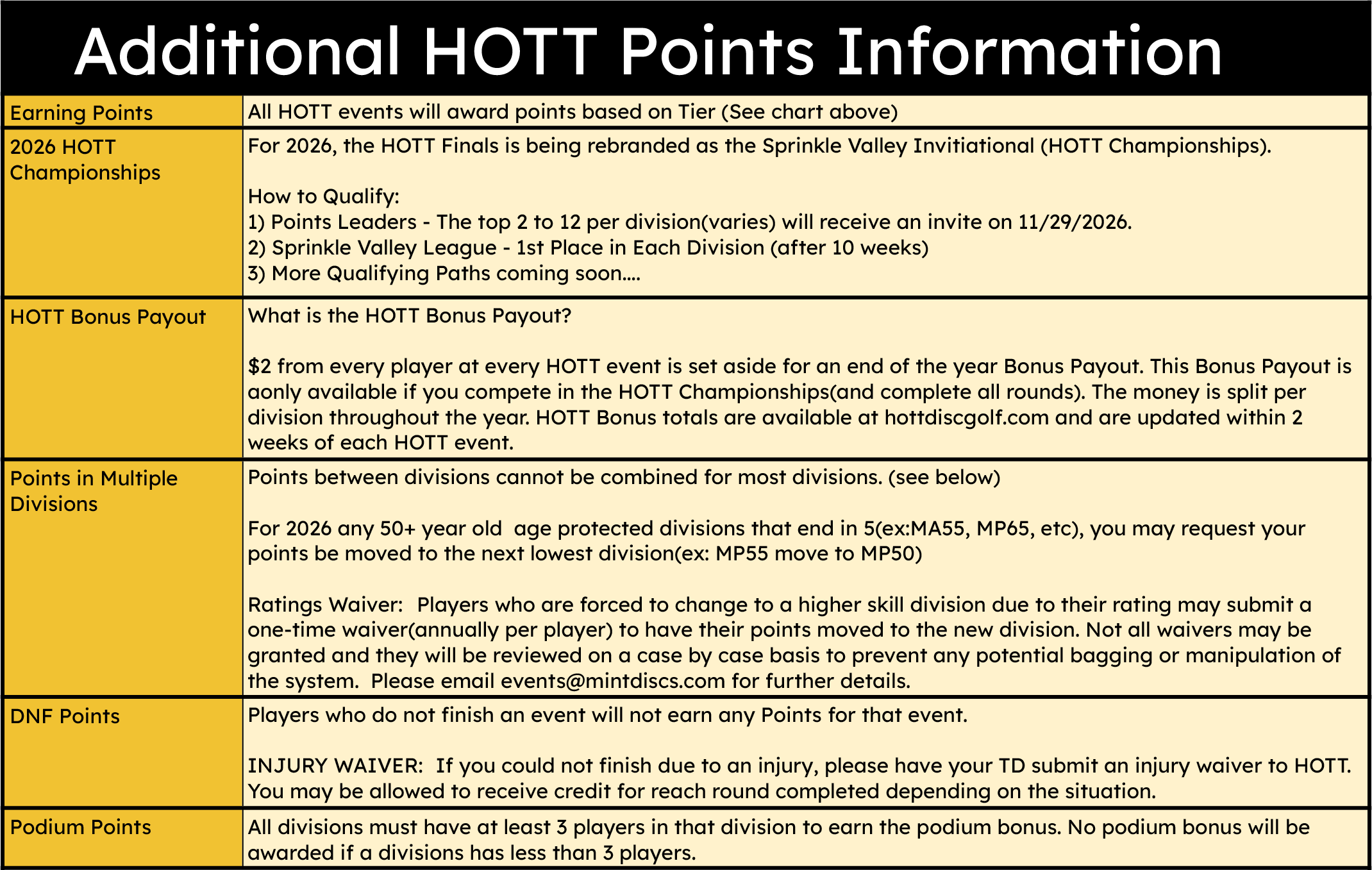 The following divisions will be available to earn HOTT Points & Bonuses in 2026. Divisions may be added or removed based on demand as well.